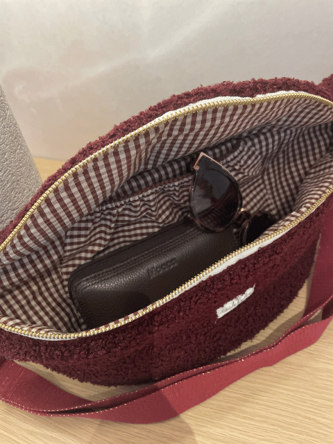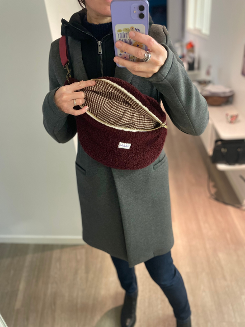 Sac banane XL – Bouclette bordeaux avec intérieur à carreaux